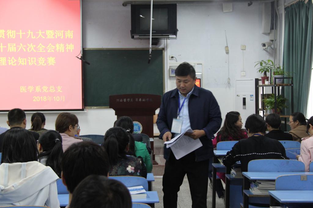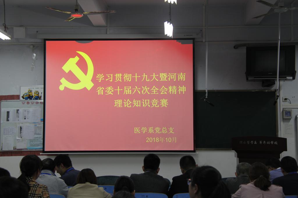 2018年10月25日下午1时,医学系党总支组织全体医学系教职工在J3-106开展学习贯彻十九大暨河南省委十届六次全会精神理论知识竞赛。本次知识竞赛以书面考试形式正式展开。