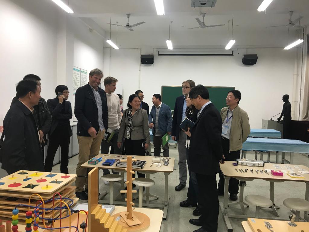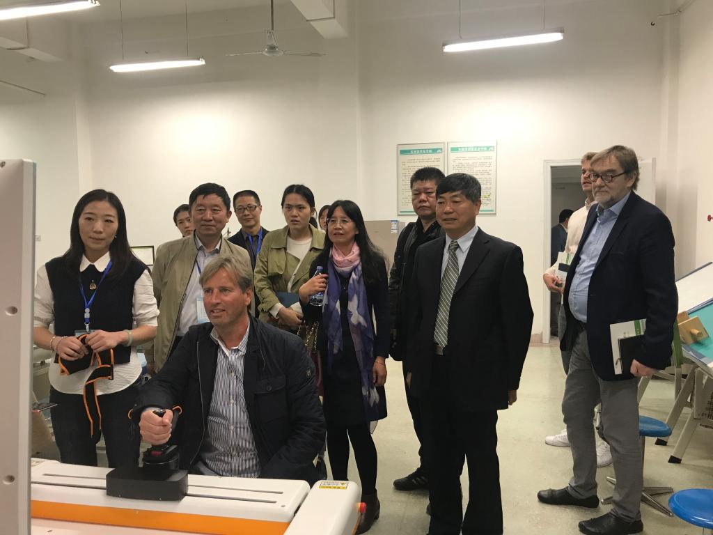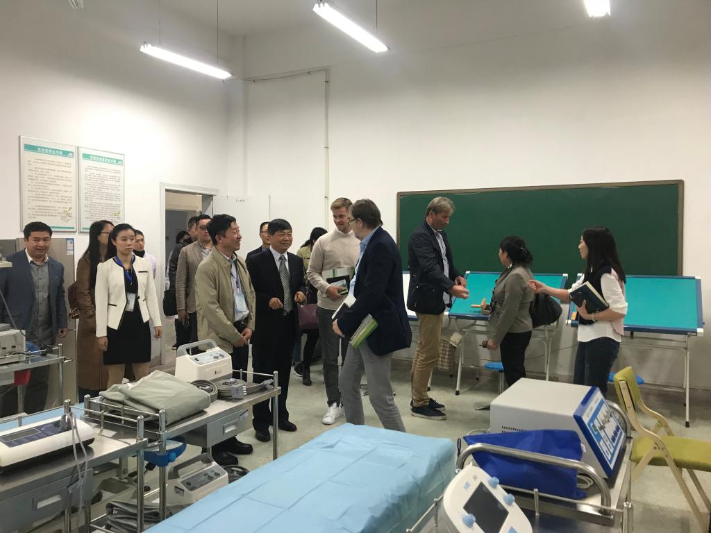 恩多康复治疗集团董事长Jens Duve,中国项目经理Dennis Duve,德国波罗的海公司主席Peter Jochimsen,玛雅国际教育集团董事长侯登峰等实地考察了我系实验实训中心康复治疗技术专业实训室。