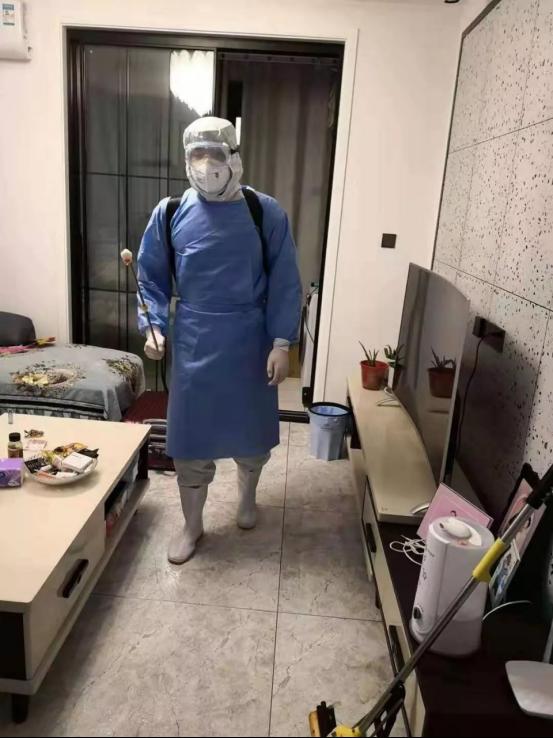 2017届毕业生,2014级临床一班李二辉 ,在郑州市经开区潮河社区卫生服务中心工作,在幸福滨水家园做疑似肺炎人员家庭消毒工作。