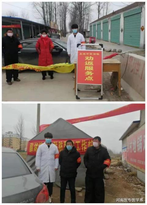 “面对突发的疫情,全国的医务工作者都逆行向前,作为一名医生、一名共产党员更是要积极参与其中。由于交通管制无法正常返院工作,我仍想为此次疫情尽自己的一份力量。我因此向村党支部请战,申请加入村镇疫情联防控制工作,在入村主要路口对人员进行测量体温、宣讲有关疫情防止知识;并通过本村微信群、村广播等向村民讲解疫情发展状况,告知村民不信谣、不传谣,以积极的心态对待此次疫情;同时配合村医对本村管辖范围的外出务工返回人员进行自我隔离劝导,及时跟踪随访身体情况。希望我们严格防治把控工作成为村里的一道安全线,使村民不被感染、在家安心生活,也为战胜疫情贡献出自己力所能及的力量。” --- 16级医学系临床医学专业毕业生黄祥银 现参加河南省第二人民医院 助理全科医师规范化培训 从大年初三开始就在永城市薛湖镇李草楼村疫情联防控制站值班。