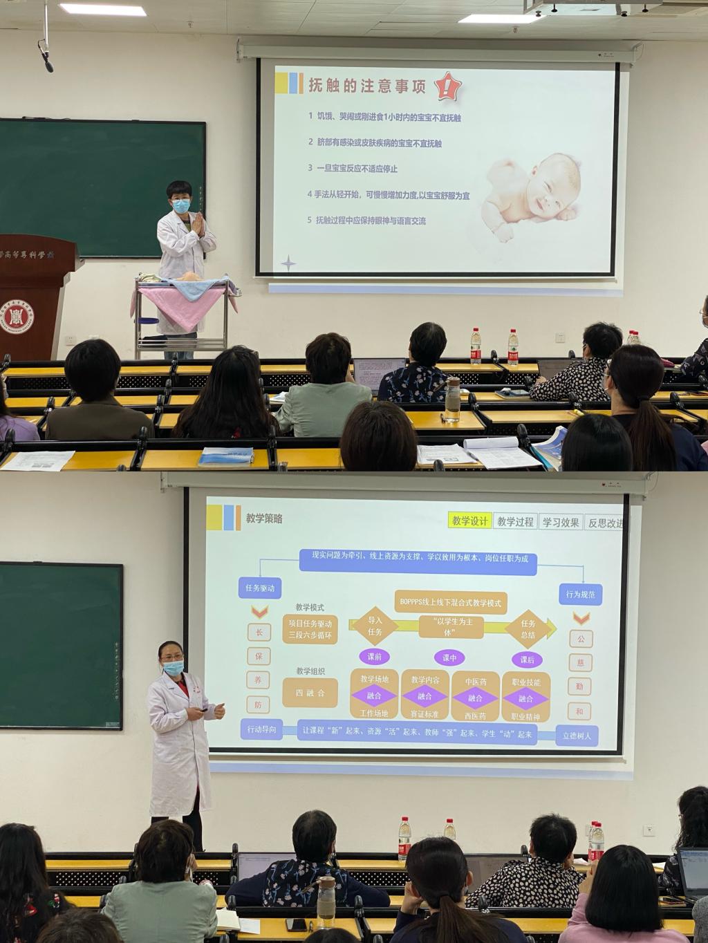 获得2022年校级教学能力比赛一等奖的儿科教学团队进行了现场汇报,首先由张爱娥老师对教学实施报告进行了阐述,随后由赵洋老师对“婴儿抚触”进行了实训教学展示,最后由彭秀青老师针对“维生素A、D缺乏症预防”进行理论教学展示,汇报结束后,刘红敏、高凤兰、王黎三位专家围绕教学设计、教学实施和教学组织等方面提出宝贵建议,剖析了团队在参赛教案、教学实施报告、专业人才培养方案和课程标准等方面的备赛经验。并强调互动教学,互动不仅包括课本知识的学习,还有生命意义的领悟、道德规范的认同、情感情操的陶冶。