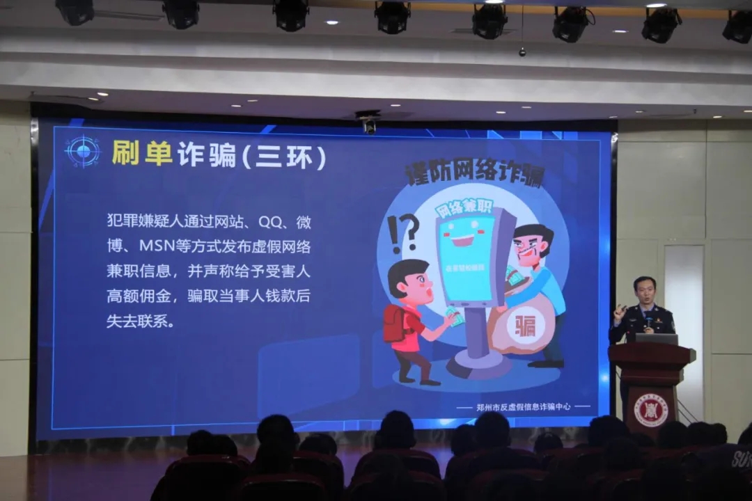 派出所反诈中心副主任相冰进行了“防范电诈,拒绝灰产"主题宣讲。相主任对电信诈骗的现状进行了简要分析,并表示电信诈骗是一种不同于传统犯罪的新型犯罪方式。受骗人员包括员工,企业家,明星等,涉案金额从几百到几十万。相主任还分析了多起老员工因不堪校园贷重负而结束生命的惨痛案例。提醒同学们不要轻信陌生电话短信及不明链接,避免个人信息泄露。